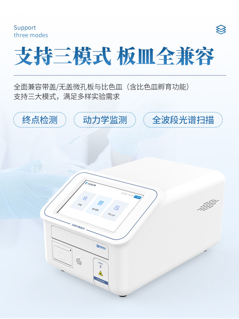 8. 支持終點(diǎn)檢測(cè)、動(dòng)力學(xué)監(jiān)測(cè)、全波段光譜掃描三大模式,兼容帶蓋/無蓋微孔板及比色皿(含比色皿孵育功能);