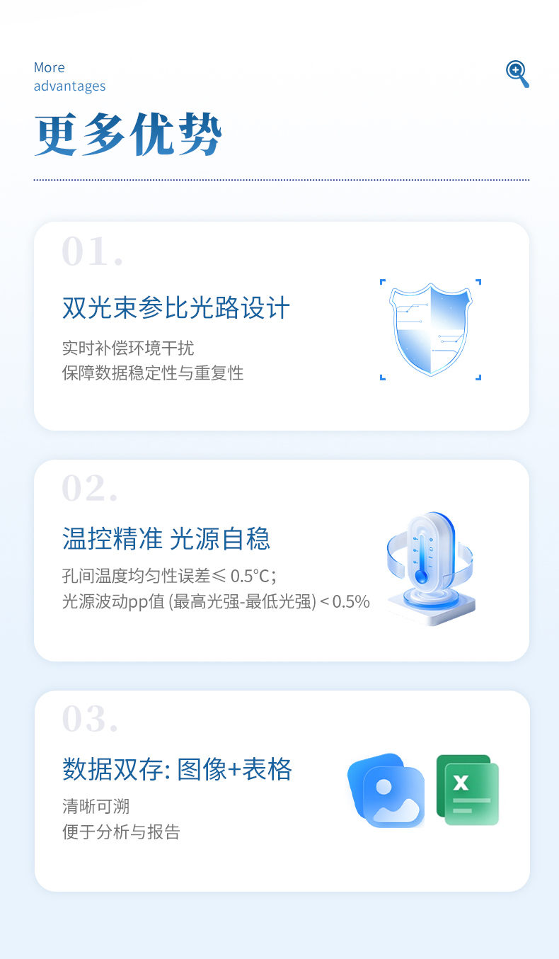 7. 雙光束參比光路設(shè)計(jì),實(shí)時(shí)補(bǔ)償環(huán)境干擾,保障數(shù)據(jù)穩(wěn)定性與重復(fù)性;