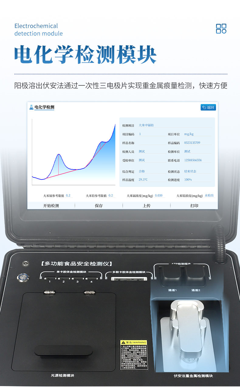 7、★電化學檢測模塊,陽極溶出伏安法通過一次性三電極片實現重金屬痕量檢測,快速方便。